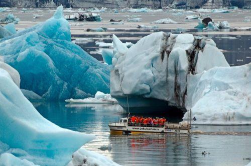 Wij maken hier een boottocht met een amfibievoertuig, dat tussen de ijsschotsen door vaart.